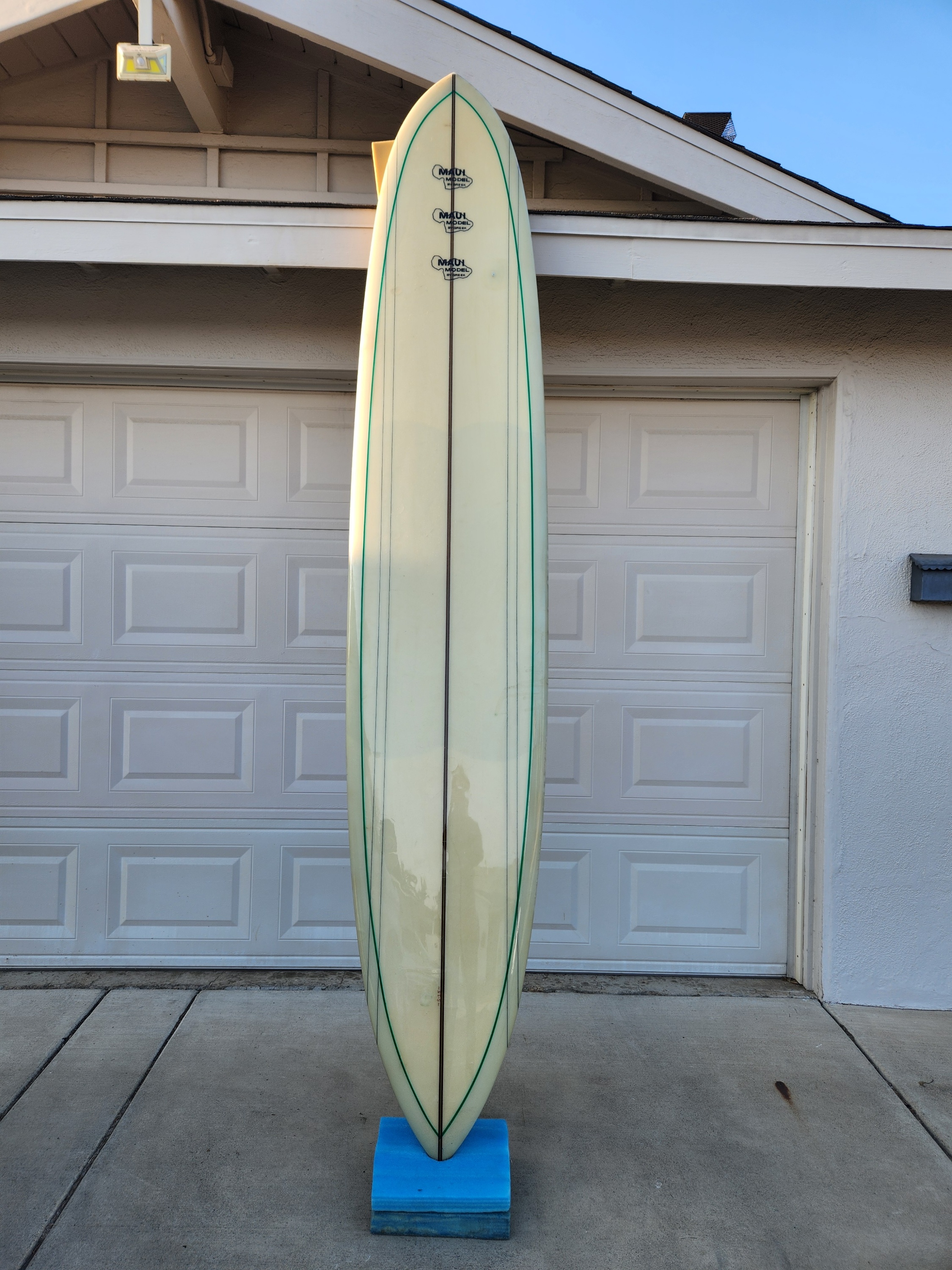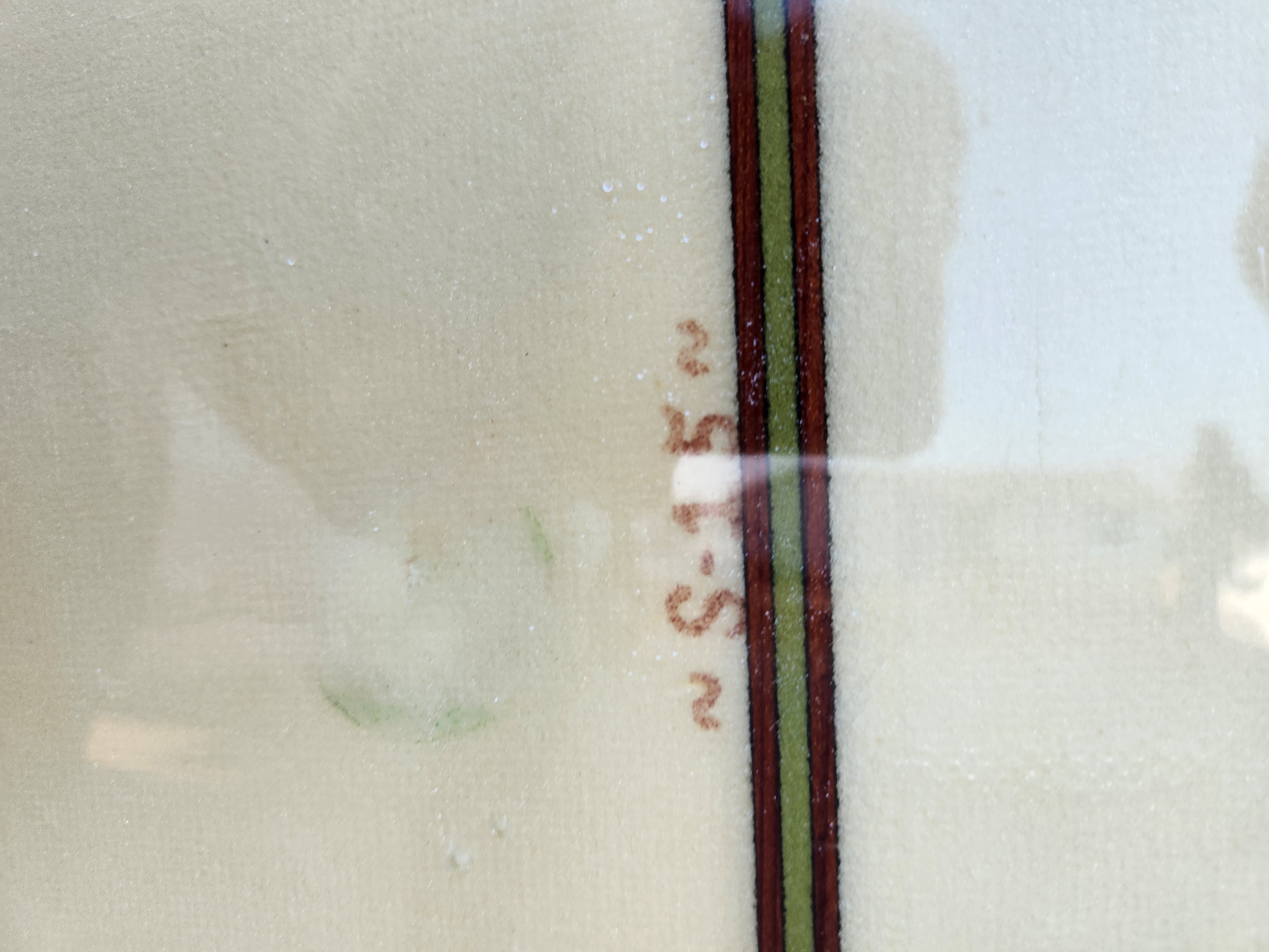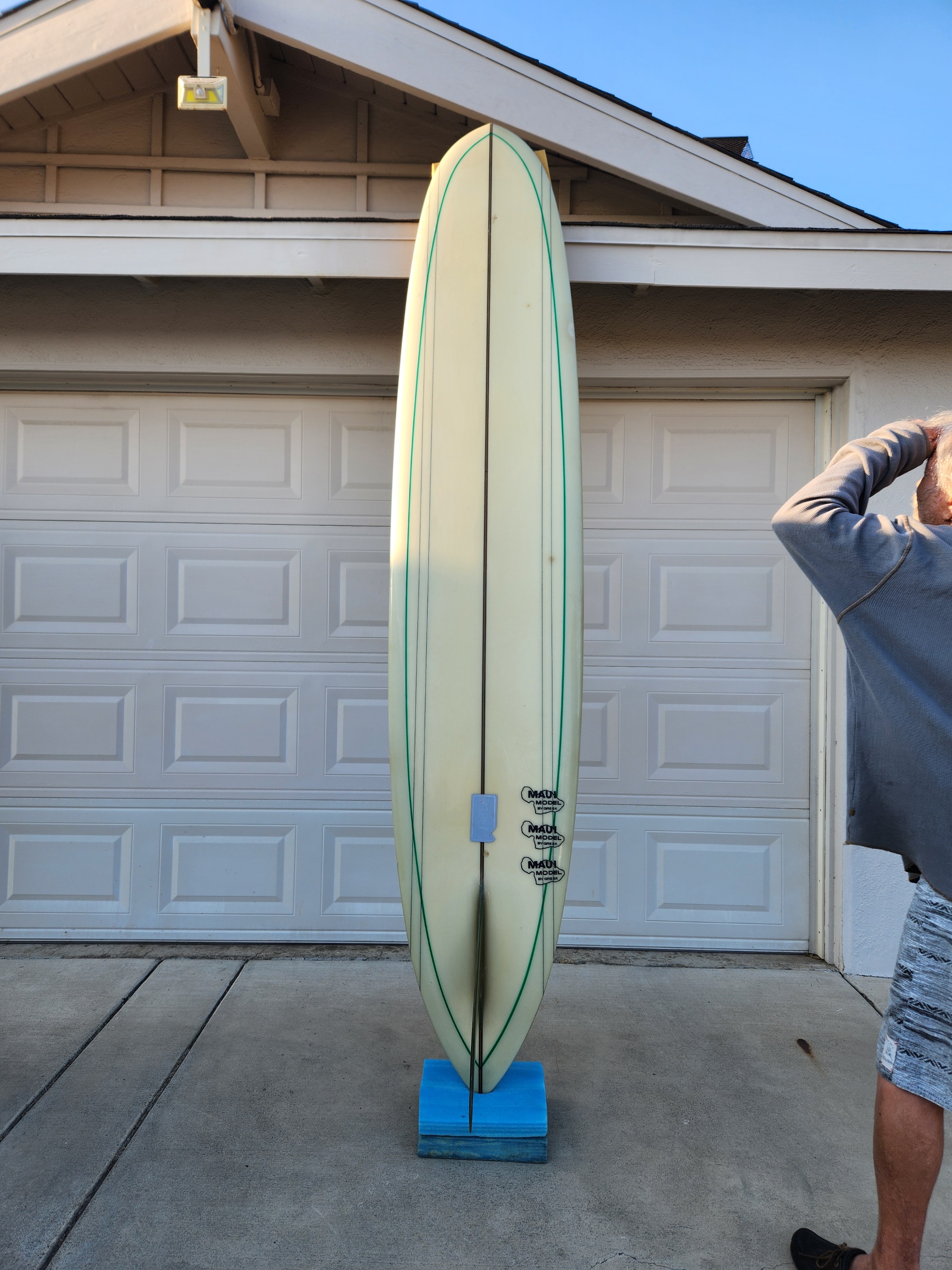 1968 Greek – Maui Model. 9’5”. Glass on fin, green tint in gloss on board, green pin lines on